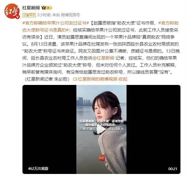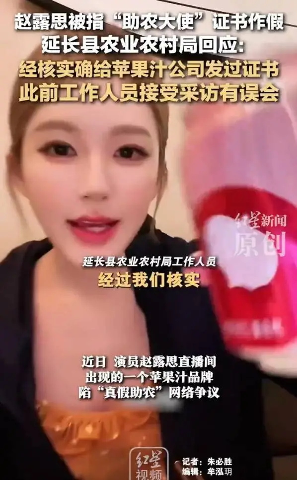 近日,演员赵露思直播间出现的苹果汁品牌陷 “真假助农” 争议。8月13日凌晨,该品牌在社媒发布陕西延长县农业农村局颁发的 “助农大使” 证书自证,网友因公章不清晰质疑证书为假。13日晚间,延长县农业农村局工作人员告诉红星新闻记者,经核实,确给该品牌企业颁发过 “助农大使” 称号,未对任何个人颁发。工作人员补充,早前有媒体询问是否给赵露思发过助农称号,接线员因此答复“没有”。