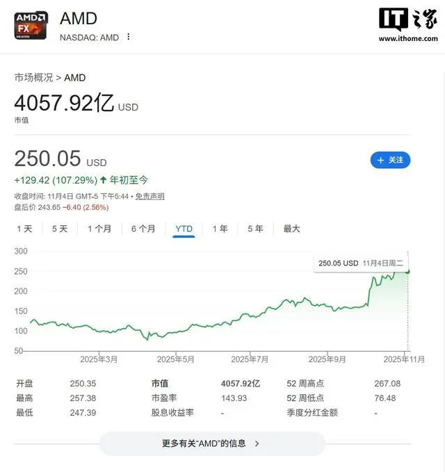 IT之家 11 月 5 日消息,AMD 昨日(11 月 4 日)公布了 2025 财年第 3 季度(截至 9 月 27 日)财报,公司营收达 92.5 亿美元,同比增长 36%,调整后每股收益为 1.20 美元,双双超出华尔街预期。